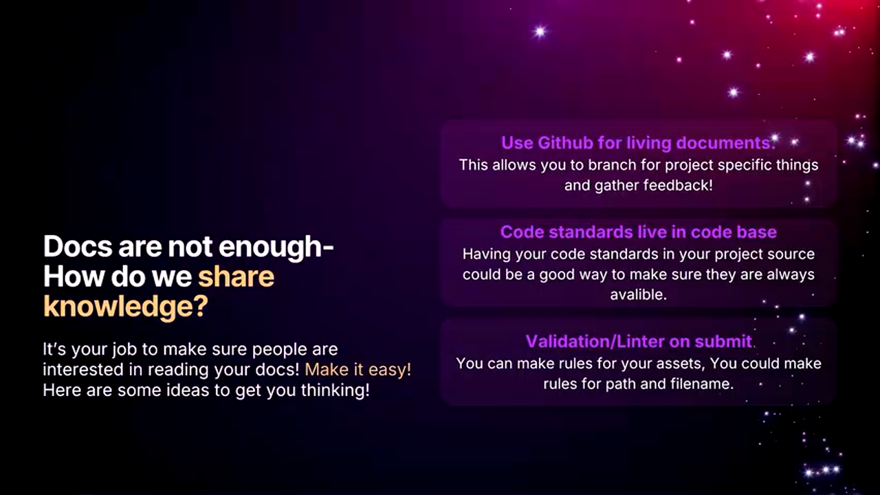 文档应该包含: - 资产制作标准(多边形数量、纹理分辨率、材质规范等) - 命名约定(Naming Conventions) - 代码风格规范 - 性能基准和优化准则 - 工作流程最佳实践