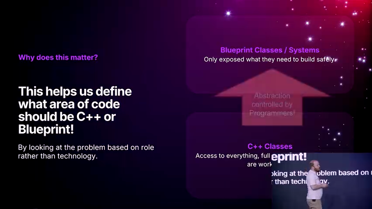 3. Blueprint与C++的协作哲学 - 技术差异映射职能边界 - 控制边界:C++封装核心逻辑,Blueprint提供灵活性 - 始终用C++创建基类