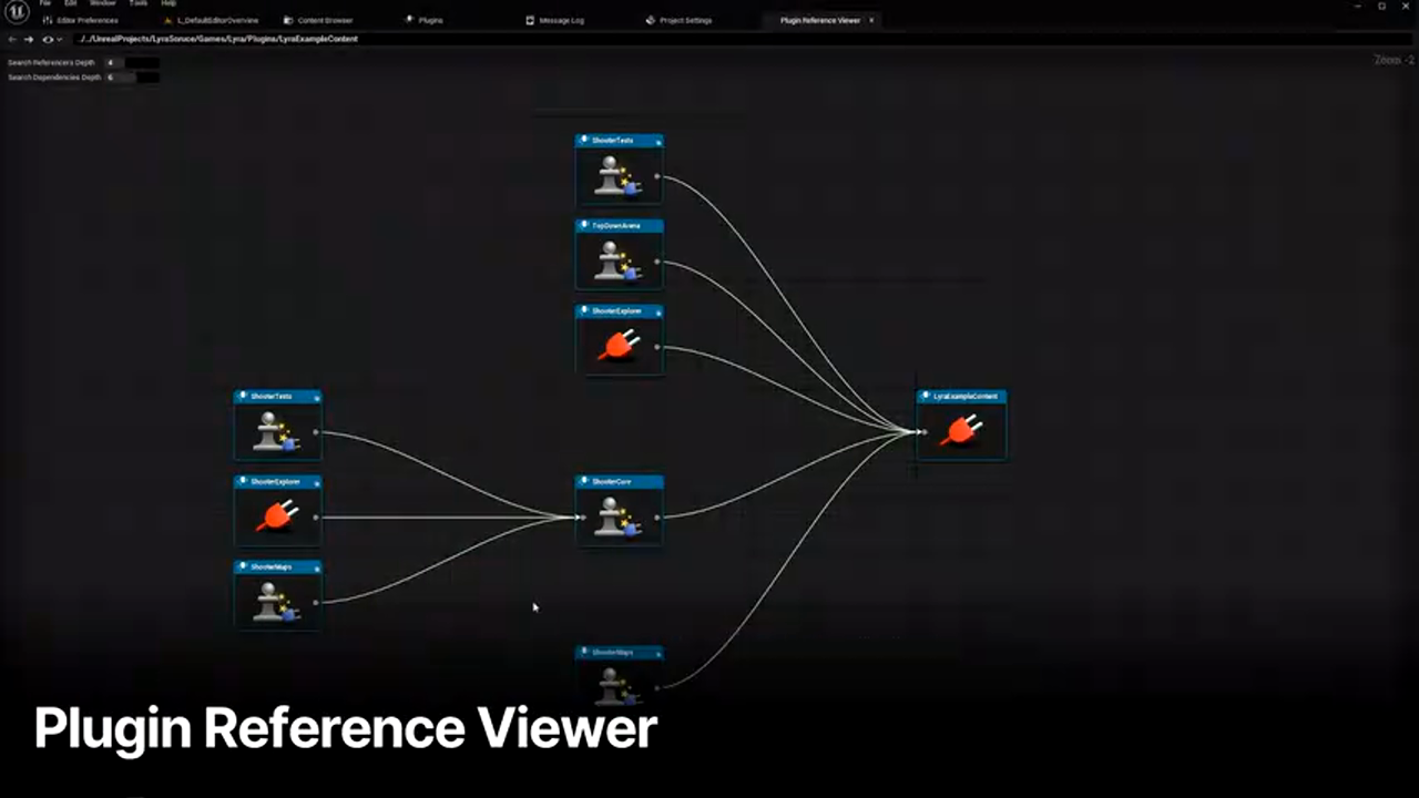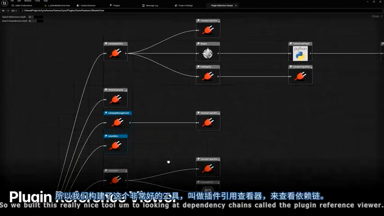 这些工作流程往往会产生相当复杂的插件依赖关系。因此Epic构建了一个非常好的工具来查看依赖链,称为**Plugin Reference Viewer**(插件引用查看器)。